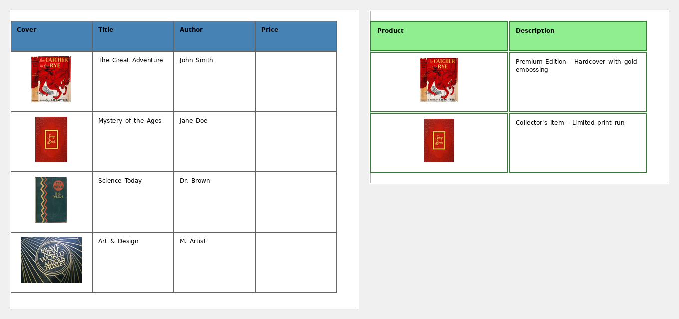 • Mixed content (images and text) in cells